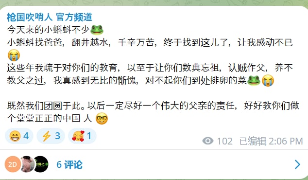 投稿机器人🤖: @laohuhaha_bot#大冲塔运动 :同志们冲啊🏃♂️!#大自爆运动 :其实本该叫爆料革命,但被郭大总统给糟蹋了……🥲😭😭习近平倒车加速车友会🐸群: @SpeedUpCN墙国蛙蛤蛤🐸推特:https://x.com/GFWfrog墙国蛙蛤蛤🐸油管:https://youtube.com/@GFWfrog友台:维尼之声 @VoiceofPooh乳透社 @Ruters0615